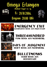 Ansonsten hoffen wir euch alle am Freitag, den 20.10.2006 im Omega in Erlangen begrüßen zu können! Der Eintritt kostet 3€, das Plakat gibt's hier zum download. |